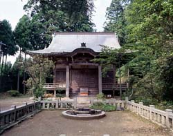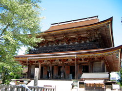 吉野駅…ロープウェイ吉野山駅下車、黒門・銅の鳥居・仁王門を経て徒歩約10分 金峯山の高台にそびえたつ、東大寺大仏殿に次ぐ木造の大建築。現在の本堂は1592(天正20)年に再建された、室町末期を代表する建造物です。正面5間、側面6間、建物の周りに藻腰を付けた入母屋造り、桧皮葺。高さが約34メートルもあるので、吉野を巡る折々にその威風を見ることができます。本尊として3体の蔵王権現像をまつり、中尊の高さは7メートル余りの巨像。堂内は内陣と礼堂からなり、松やチャンチン(ツツジの一種)など自然木を素材のまま使った柱68本が林立するさまは豪壮です。また、内陣の2本の金箔張りの化粧柱や須弥壇は太閤秀吉が花見の際に寄進したものといわれ、桃山建築の美しさを残しています。