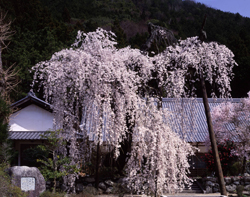 エドヒガンの品種。樹高約10メートル、枝張りは東西、南北とも約10メートルで見事な樹姿を見せています。ほかにも、東吉野村の村内は季節の花々、紅葉、雪景色が村中を豊かに染め上げます。彩りに誘われて、年中楽しい山歩きが楽しめます。