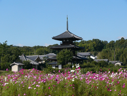 法輪寺の三重塔は、法隆寺・法起寺とともに斑鳩三塔と呼ばれています。創建については、2つの説があり、一説には622(推古30)年に聖徳太子が自らの病気平癒を祈願し建立を発願、その子山背大兄王と孫由義王(ゆぎおう)が建立したという説で、もう1つは、670(天智9)年の斑鳩寺の炎上後に百済の開法師・円明法師・下氷新物が合力して建立したという説です。また、境内には会津八一の歌碑があります。