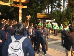 生い茂る木立に威厳ある神社で、祭神は日本大国魂大神という大和の国の地主神。神名にちなんでこの神社付近を「やまと」と呼んでいたのが、次第に広まり、奈良を指す言葉となり、やがて日本そのものを「やまと」というようになったといいます。奈良時代、朝廷の命により唐へ渡る使者たちは、出発に際して、航海の安全を祈願されました。また、旧海軍の戦艦大和の艦内には、ここの神の御分霊が祀られていました。毎年4月1日の大和の春祭のトップを飾る「チャンチャン祭り」が有名です。