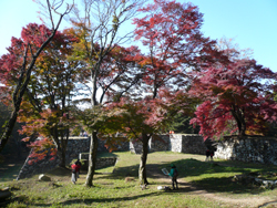 高取城は奈良盆地南方にそびえる吉野山系の標高583メートル比高390メートルの高取山の山頂に築かれた連郭式の山城です。現在は城は取り壊されてしまい石垣しか残っていませんが、城内は約10,000平方メートル、周囲約3キロメートル、城郭は約60,000平方メートル、周囲約30キロメートルという日本一の大きさを誇る山城です。「巽高取雪かと見れば、雪ではござらぬ土佐の城」と詠われています。本丸からは吉野の山々が一望する事ができます。