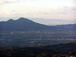 高取城跡へと続く山道の途中にある、大和盆地一円を見渡せる国見櫓跡です。眼下には、高取の町並みともう一つの城のあった貝吹山、大和三山、金剛山、葛城山、信貴山、二上山、生駒山、若草山などが望めます。天候に恵まれれば遠く六甲山、大阪市方面のビルも見えます。