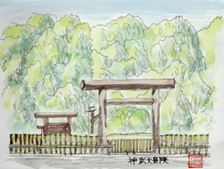 初代 神武天皇畝傍山東北陵(うねびやまのうしとらのみささぎ)。元禄10年(1697年)、塚山、すなわち現綏靖天皇陵に治定されましたが、166年後の文久3年(1863年)現在の地、字「ミサンザイ」(「神武田(じぶた)」とも云う)に治定変えとなり整備されました。明治以降、更に整備が加えられ現在に至ります。広大な陵域を占め、初代天皇陵に相応しい佇まいです。なお、「ミサンザイ」は「みささぎ」の転訛したものですが、ミサンザイが古墳かどうかは不明です。