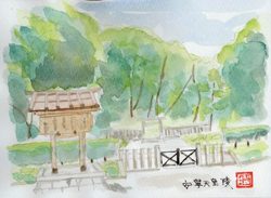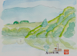 第28代宣化天皇身狭桃花鳥坂上陵(むさのつきさかのへのみささぎ)。全長約138メートルの前方後円墳です。約600基を数える新沢千塚古墳群の中の盟主的存在で、鳥屋ミサンザイ古墳とも呼ばれ、満々と水をたたえた周濠がとりまき、鳥屋池と繋がっています。この古墳の築造年代は、5世紀と云われていますが、もしそうだとすれば、宣化天皇とは年代が少々合わないことになります。この陵も孝元天皇陵と同じく文久3年に治定されました。