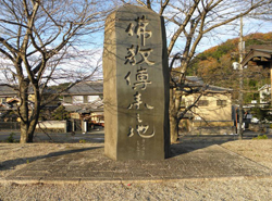 初瀬川のほとりに3.8メートルの碑があります。欽明天皇の時代に百済の聖明王の使節が訪れ、釈迦仏の金銅像一躯と経論若干巻物などを献上し、日本に仏教を最初に伝えたといわれています。