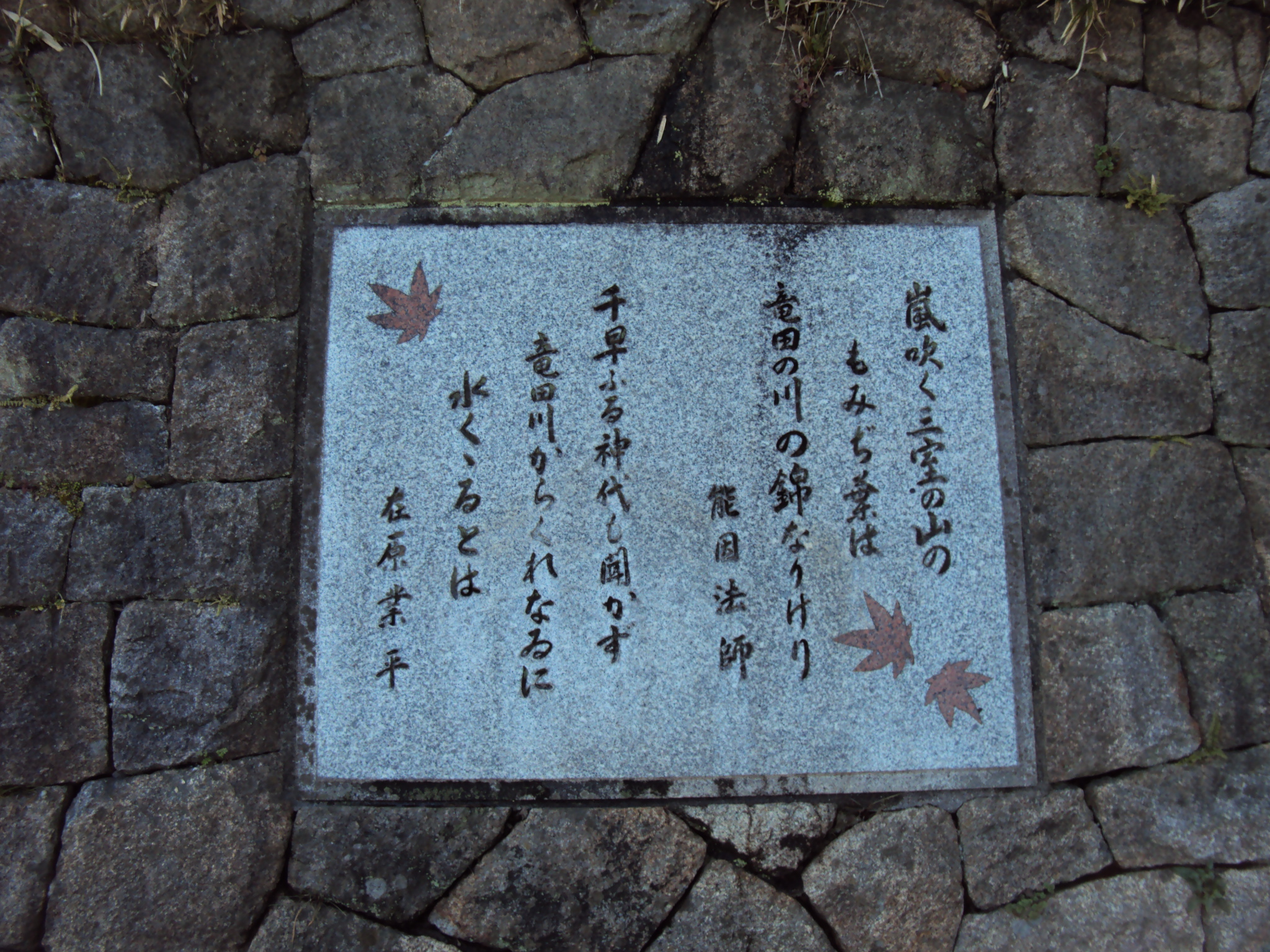 「ちはやぶる 神代もきかず 竜田川 から紅に 水くくるとは」と詠んだ在原業平の歌、「嵐吹く 三室の山の もみぢ葉は 竜田の川の錦なりけり」と詠んだ能因法師の歌で有名な竜田川です。また、「たつたあげ」という料理がありますが、この竜田揚げも竜田の紅葉から名付けられたといわれています。いずれも赤く色づく紅葉の有様から詠まれたり名付けられたりしたものです。