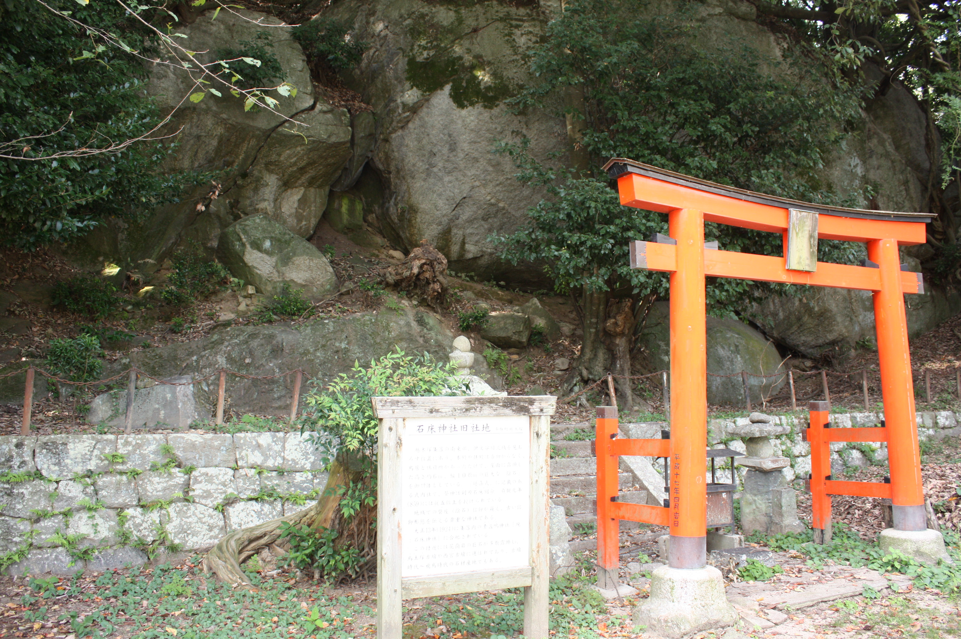 巨大な磐座を直接拝む古い形式をとどめる古社で、祭神は剣刃石床別命(けんじんいわとこわけのみこと)。越木塚集落の南、井文字川を見下ろす高台に、高さ約9m、幅約21mの巨大な岩「陰石」がある。社殿はなく、この巨岩が石床神社のご神体で、安産や五穀豊穣の神として崇められた。式内大社。