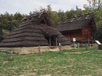 竹取公園内に竪穴式住居と高床式倉庫が復元されています。平面形は奈良県立第二浄化センターの発掘調査で検出された古墳時代の遺構です。竪穴式住居は一辺約4mの方形住居区に台形の土堤を築き、4本の支柱で棟木、垂木を支え茅を葺いています。高床式倉庫は、3×6mの平面規模で6本の堀立柱で上屋を支えています。上屋は切妻造りで茅を葺いています。
