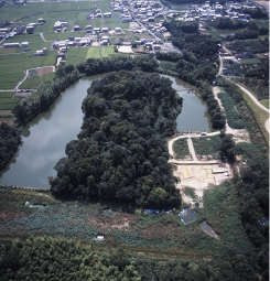 広陵町には大小様々な古墳からなる馬見古墳群がありますが、その中で最大の古墳がこの巣山古墳です。5世紀初めの葛城地域の王墓と思われています。近年の整備に伴う調査により、出島状遺構等新たな発見が相次いでいます。国の特別史跡に指定されています。