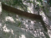 清滝は千光寺修験道の重要な行場であり、鳴川集落の入り口にあたる。滝側を此岸(俗界)、対岸を彼岸(仏の世界)とし、このあたりの参道沿いに多数の磨崖仏が彫られている。両岸の間に「勧請縄」が毎年大晦日に掛け替えられる。・八尺地蔵 清滝横の岩盤に刻まれた総高337cmの磨崖石仏で鎌倉中期の作とみられる。頭部は薄肉彫りで他の部分は線刻され、少し斜めにポーズをとった一般的な延命地蔵の姿をしている。・五尊仏このあたりは地蔵信仰が篤く、八尺地蔵の対岸に地蔵菩薩を中心に、左から阿弥陀如来、弥勒如来、地蔵菩薩、薬師如来、釈迦如来の五体の仏坐像が彫られている。その他に、貝吹き地蔵、法螺吹き地蔵、はらみ地蔵などの石仏がある。石仏群全体が町指定文化財。