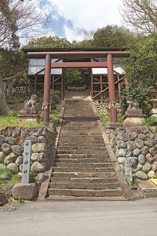 いかだ乗りの神様とされる神社。本殿へ続く62段の石段には、明和4年(1767年)の銘が刻まれた比曽石(大淀町内でとれる石英安山岩)が使われている。水分神社の鳥居の脇にある「椿の井戸」は、江戸時代に刊行された旅行案内書である「大和志」に名前が記されている。道中の旅人たちが、喉の渇きを癒したのだと想像される。