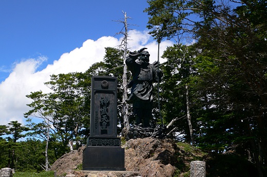 神武天皇が九州からの東征の際に大台ヶ原を越えたとの伝説がある。牛石ヶ原の牛石と相対する木立のかたわらに神武天皇が腰掛けたと伝えられる御腰掛の石があり、そこに神武天皇像が建っている。像が持っている弓の先にとまっているのは八咫烏ではなく金鵄(金色のトビ)である。