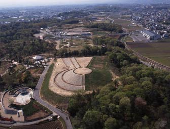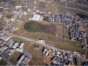 佐味田宝塚古墳は、全長112mの前方後円墳です。馬見丘陵に分布する「馬見古墳群」の中でも、前方後円墳としては最古の古墳のひとつです。明治14年に後円部頂上が発掘され、36面にものぼるとされる銅鏡をはじめ多くの遺物が出土しています。なかでも鏡背に4棟の建物の図像をあしらった家屋文鏡(かおくもんきょう)は古墳時代の建築を知る上で貴重な資料となっています。昭和60年度に墳丘の範囲確認調査が実施され、墳丘の裾を巡る鰭付(ひれつき)円筒埴輪列が確認されました。盾、靫(ゆぎ)、蓋(きぬがさ)形等の形象埴輪も出土しています。これら出土した埴輪から、4世紀後半から5世紀初頭にかけて築造されたと考えられています。国指定史跡。