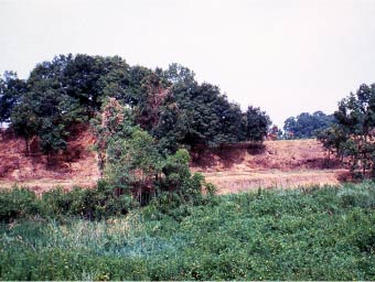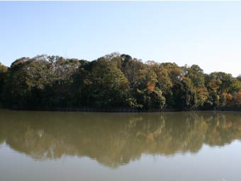 大塚山古墳は前方部を南に向けた前方後円墳で、墳丘長は197mを測り、河合町で最大の古墳です。墳丘は三段に築かれており、墳丘の周囲には濠と堤が巡り、最近の発掘調査で堤の外側にも濠状の地形が巡ることがわかってきました。後円部墳頂には窪地があり、かつて石材も散乱していたことから、埋葬施設は竪穴式石室と推定されます。また、前方部墳頂には明治40年(1908)に行われた軍隊の大演習に際し明治天皇の野立所となったことを示す石碑が建てられています。出土した埴輪の特徴などから5世紀後半に造られたと思われます。被葬者は不明ですが、大和川の水運と密接な関わりを持った人物と考えられます。県道を挟んで西側にある九僧塚(くそうづか)古墳は大塚山古墳の主軸に並行する一辺30mほどの方墳で、大塚山古墳に伴って計画的に配置された副葬品埋納用の墳丘と考えられます。