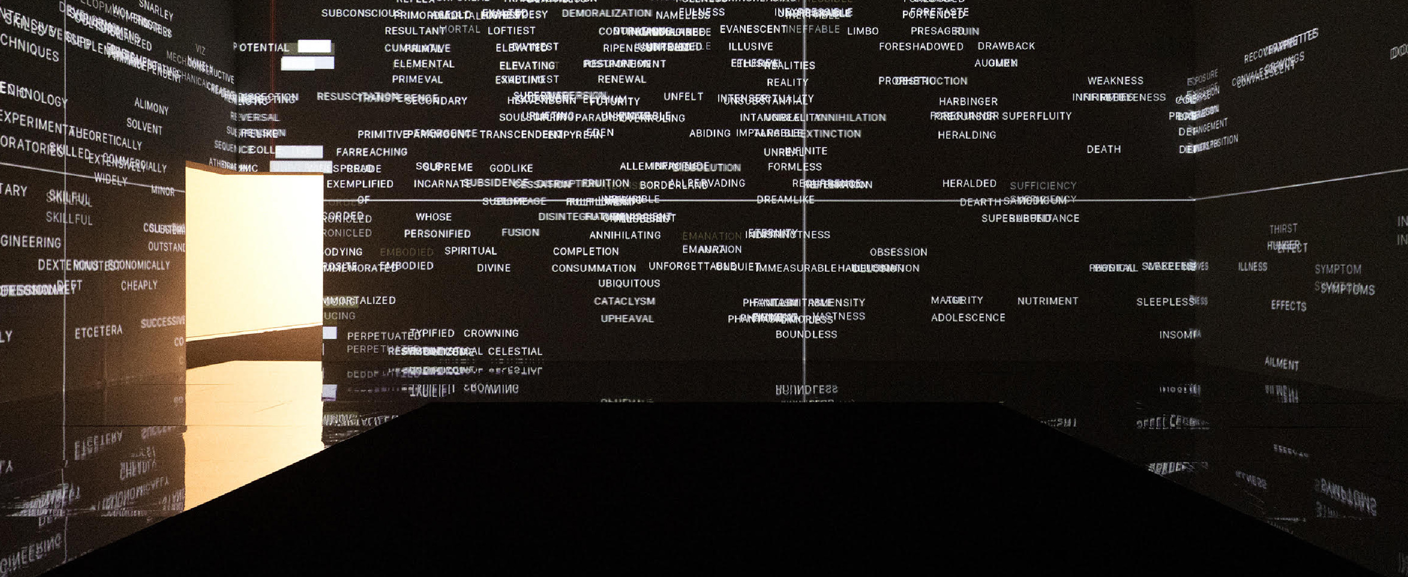 無数の英単語が相互の関係性によって位置が決定され、現れた言葉は、浮遊し、次第に加速し、交錯を繰り返しながら、最後には動力を失ったかのように漂い、落ちていく。重力からの解放を思わせる空間がそこに出現している。