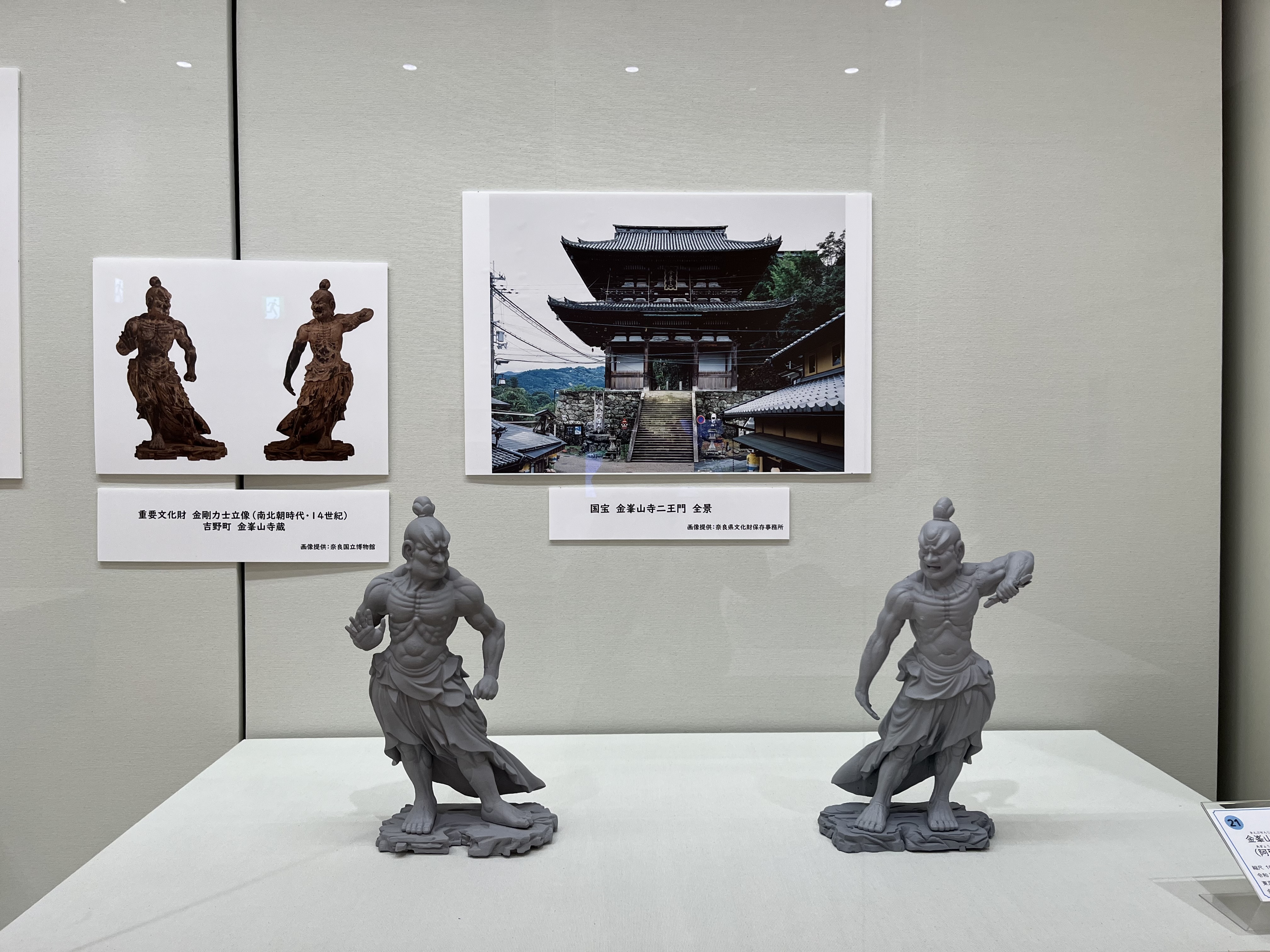 こちらは吉野町の金(きん)峯(ぷ)山寺(せんじ)、国宝の二王門(におうもん)に安置される2軀(く)の金剛(こんごう)力士像(りきしぞう)(重要文化財)のレプリカです。像高5メートルを超える実物は、3年前に保存修理を終え、二王門の修理が完了する令和10年度(予定)まで奈良国立博物館で公開されています。