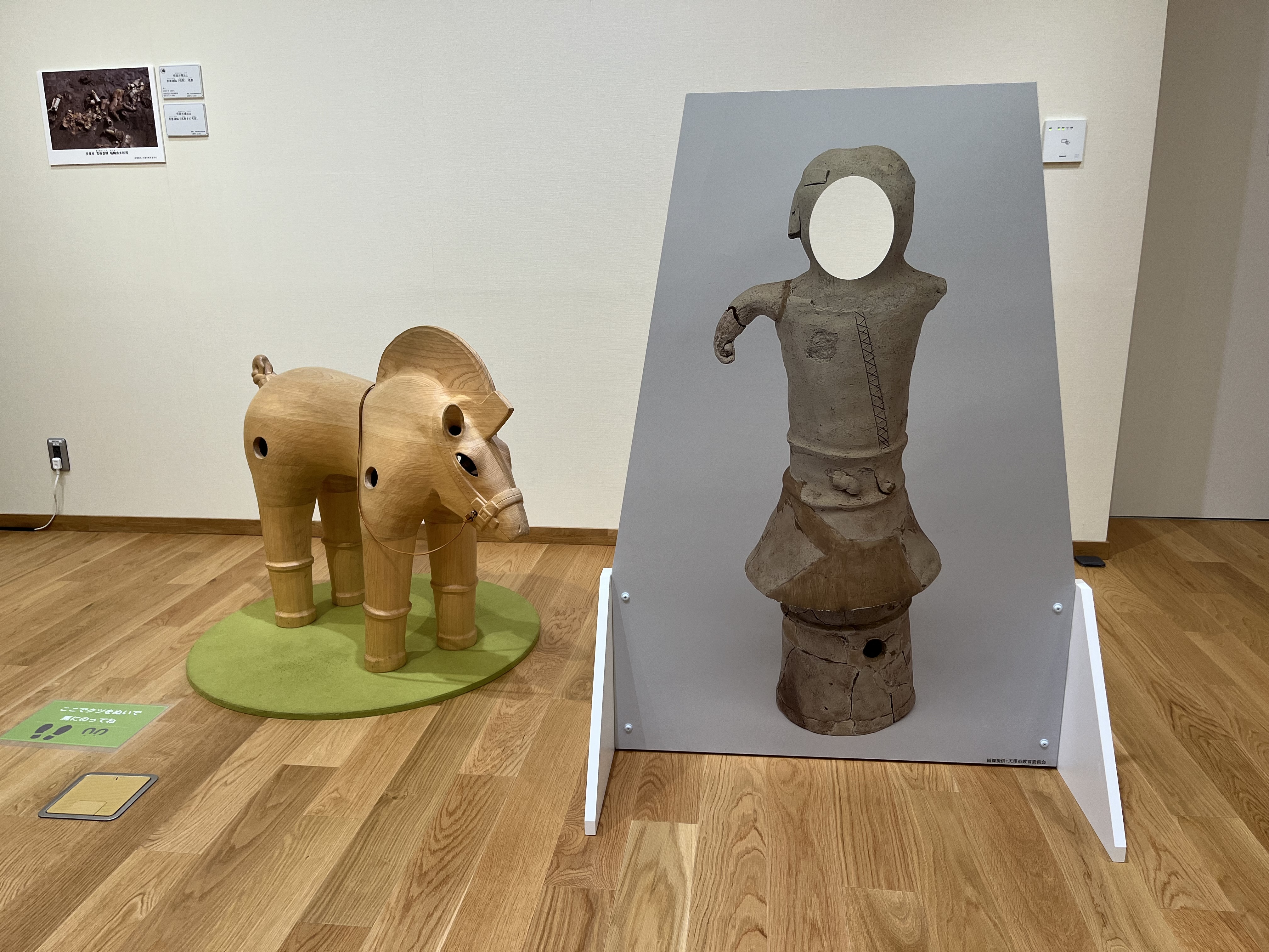 会場では、天理市の荒蒔(あらまき)古墳から出土した馬形埴輪(はにわ)のレプリカも展示されています。木でできたこのレプリカには乗ることもできるんです。同じ古墳から出土した人物埴輪の顔ハメパネルと並んで、記念撮影はいかがでしょう?