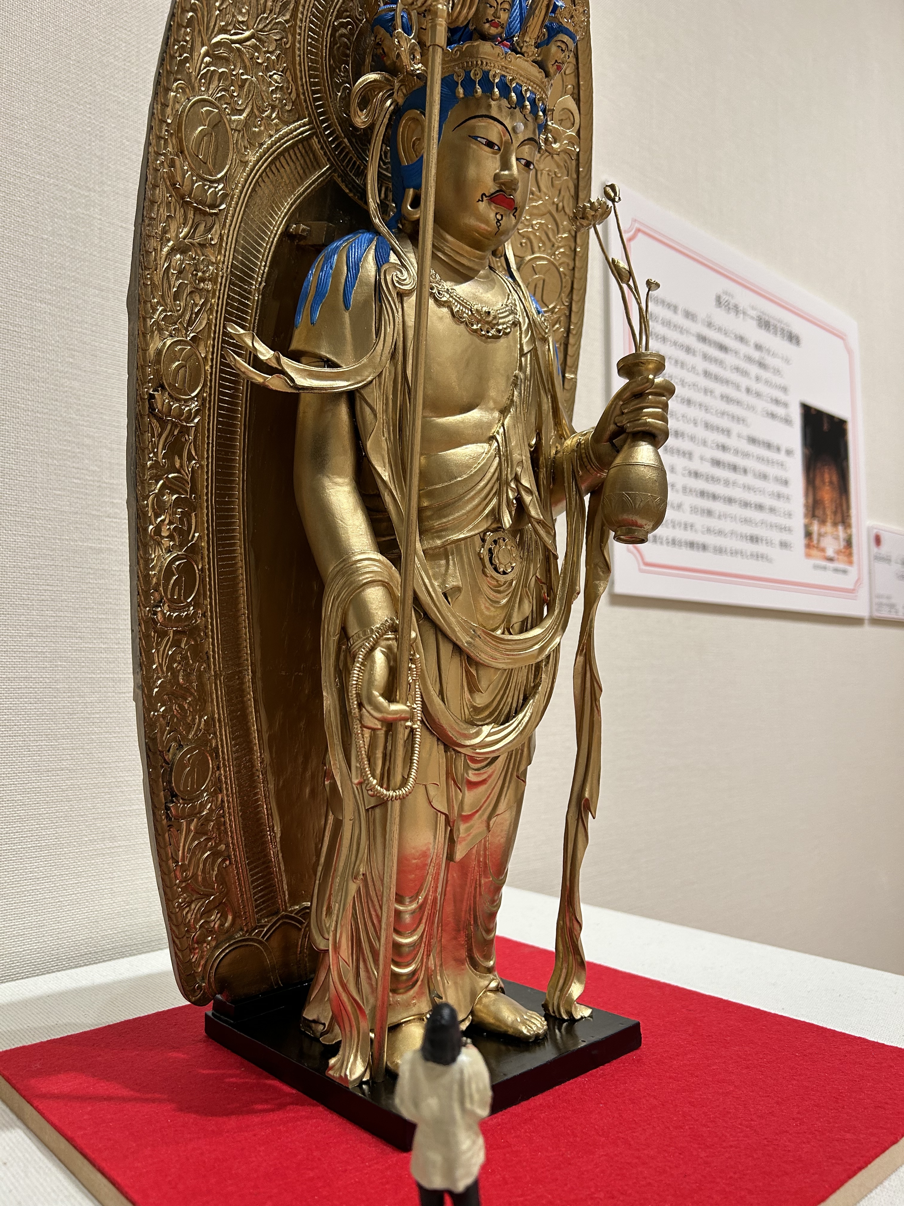 こちらは桜井市に所在する長谷寺(はせでら)のご本尊、高さ10メートルを超える十一面観音菩薩像の20分の1サイズの縮尺模型です。手前に置かれた人物と見比べてみて下さい。観音像の大きさが一目瞭然です。