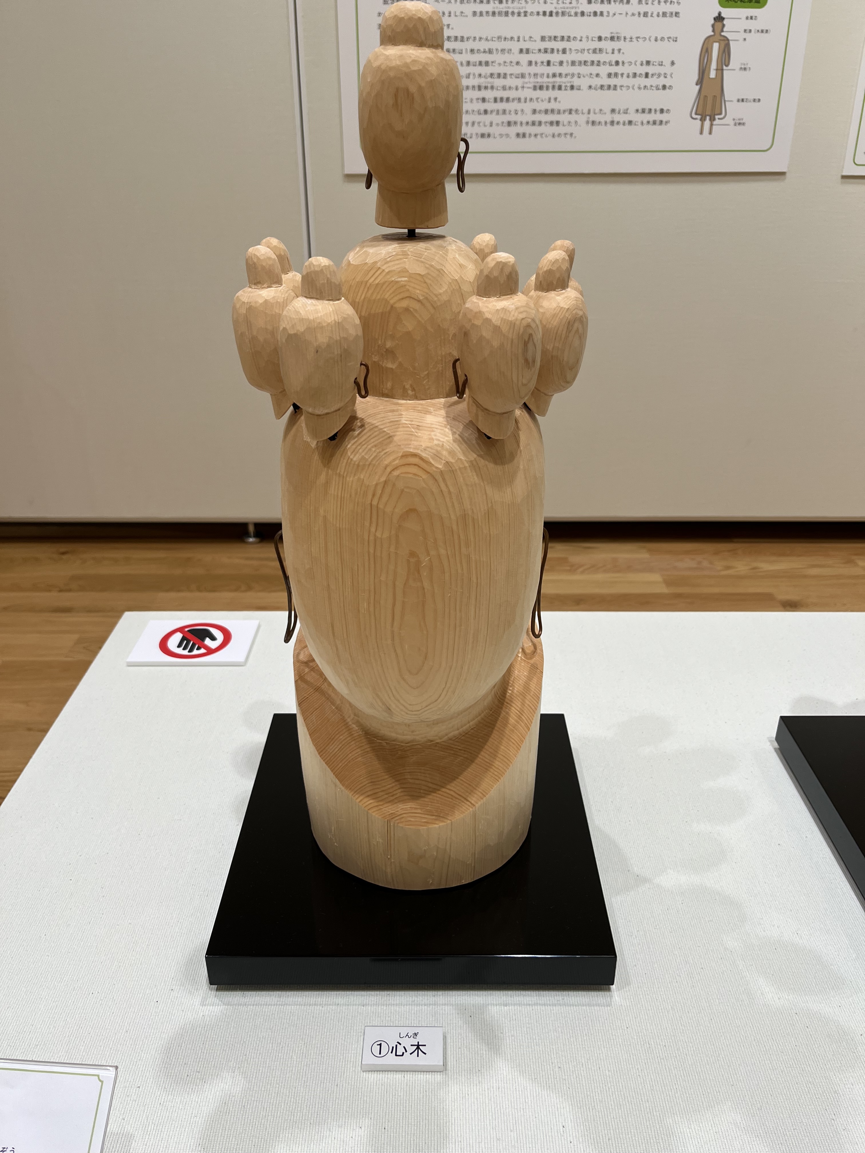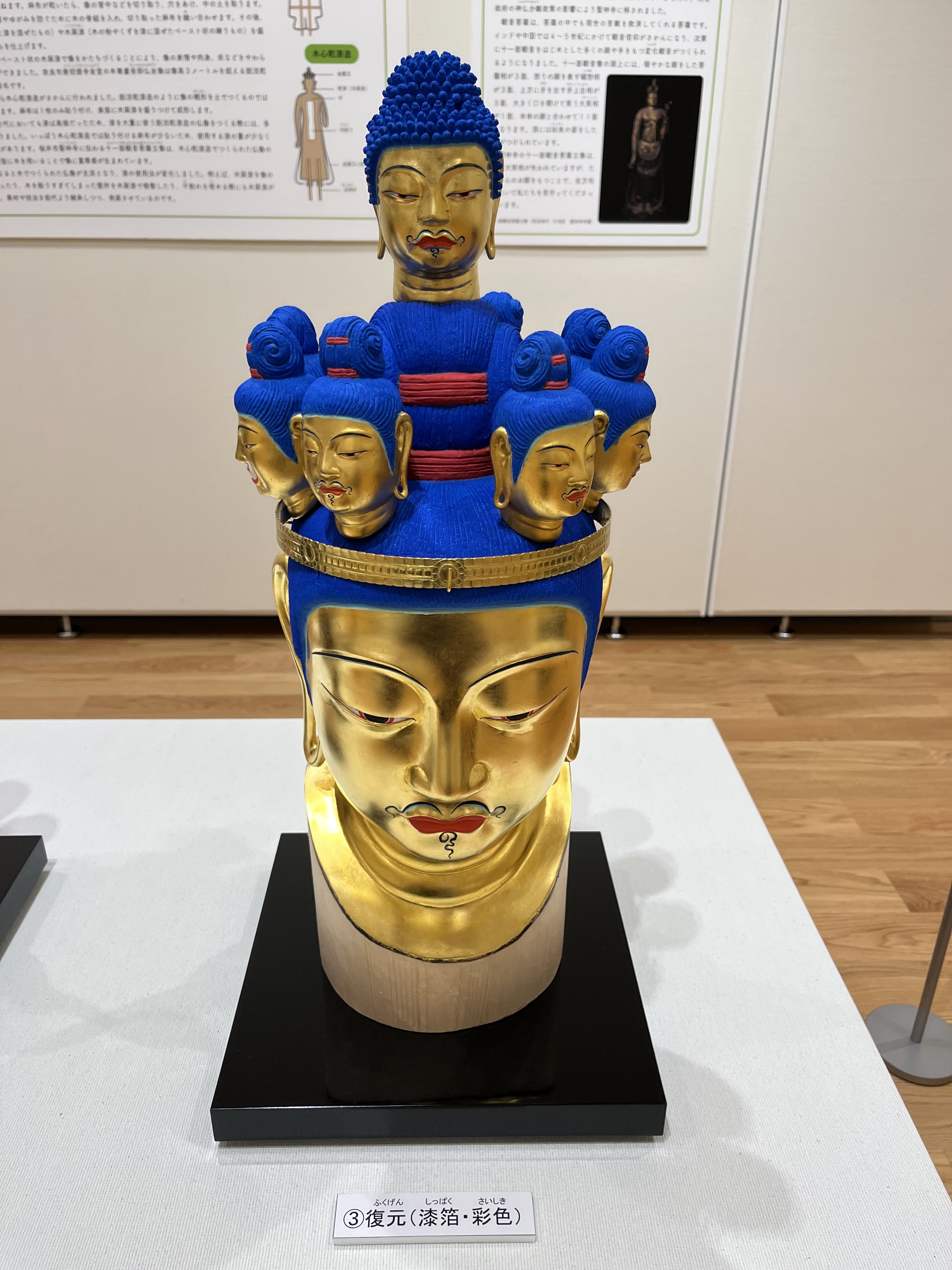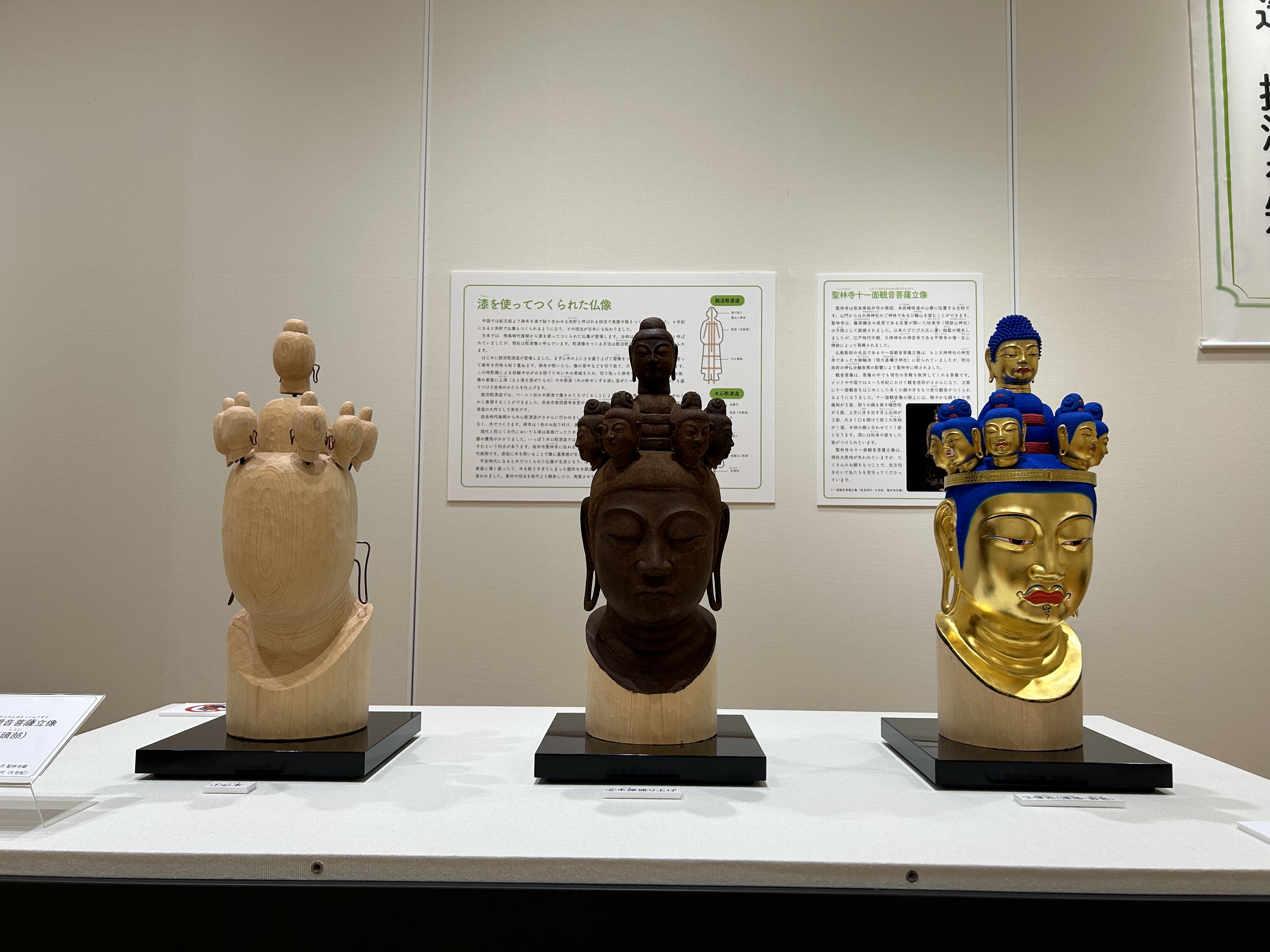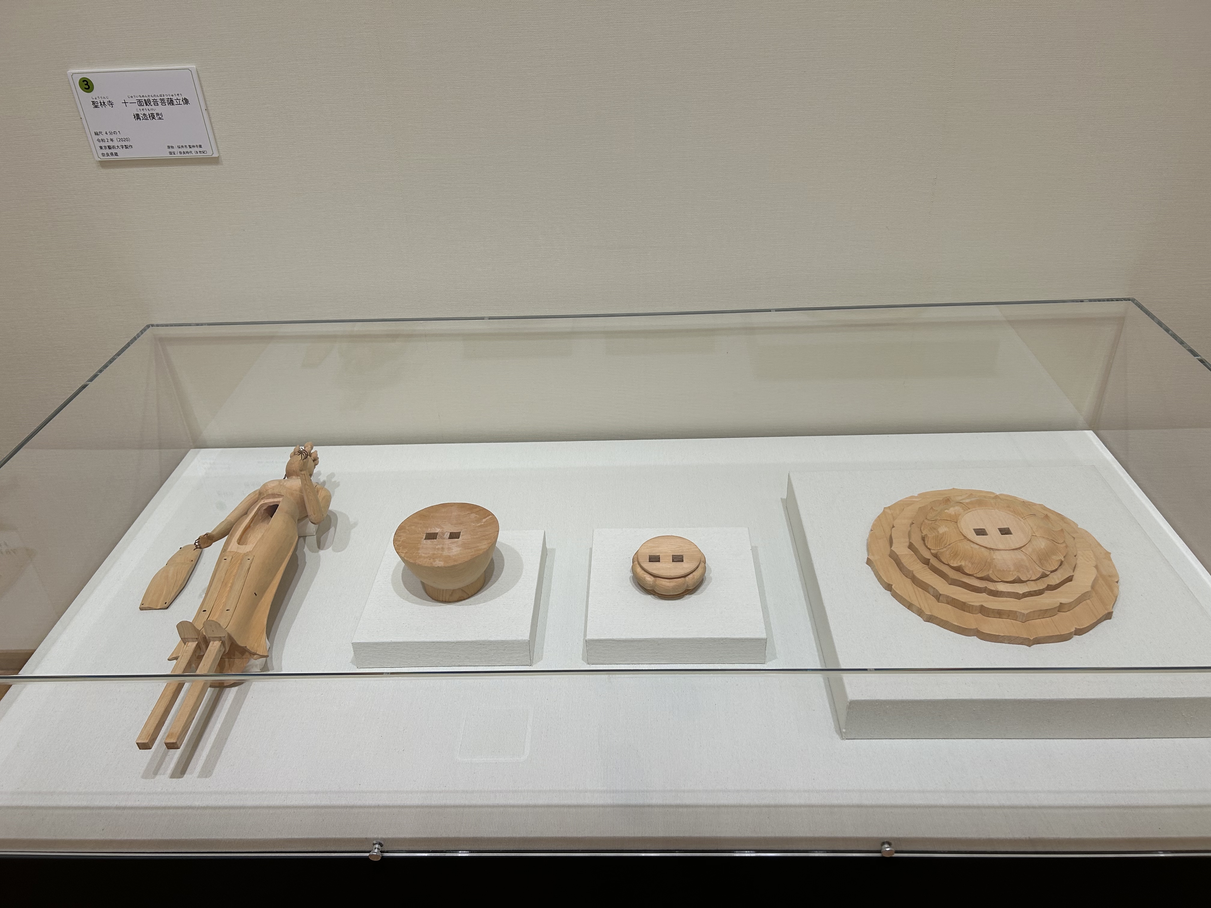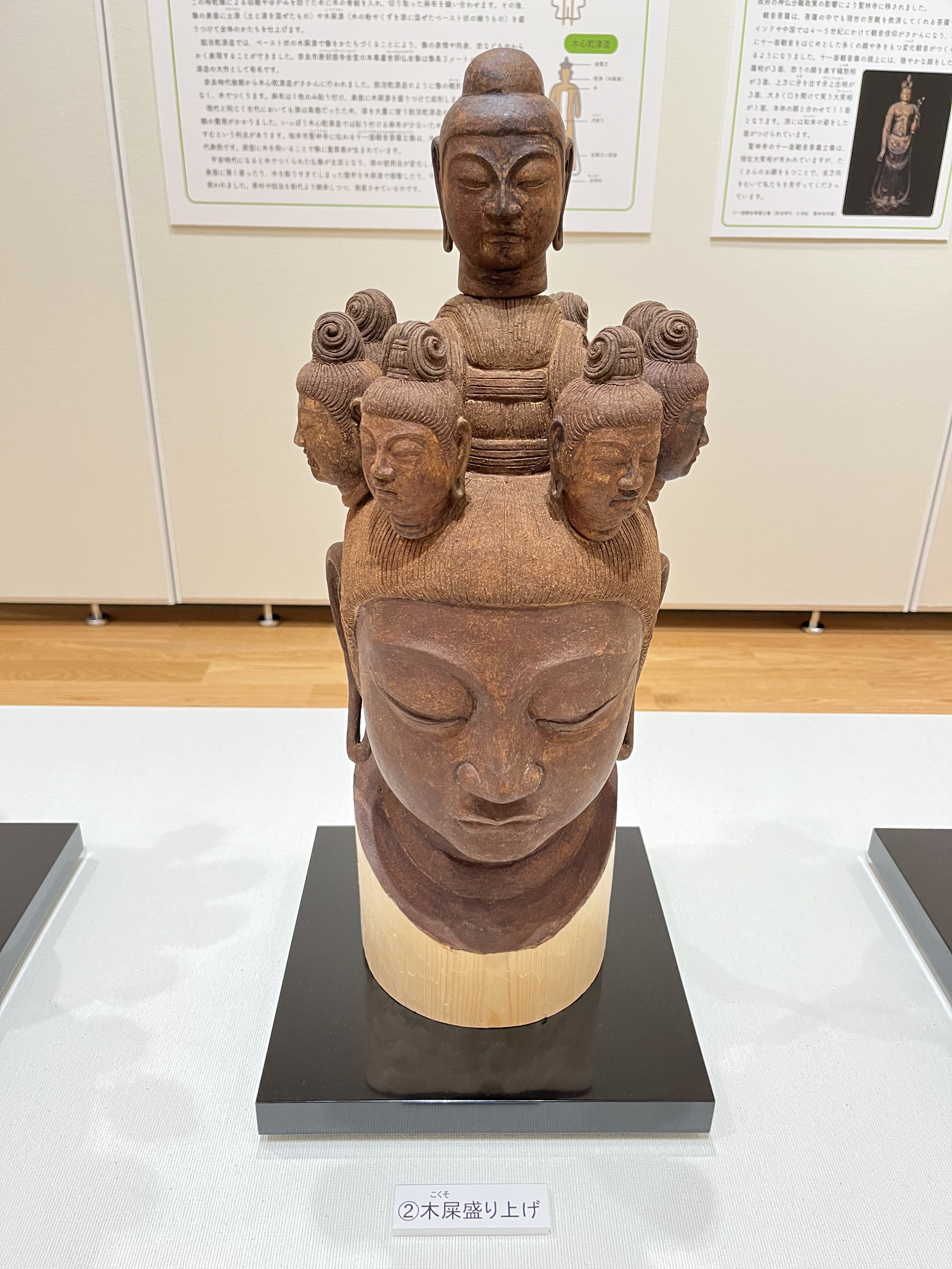こちらは国宝・聖(しょう)林寺(りんじ)十一面観音菩薩像(奈良時代)の頭部が完成するまでの3つの段階をあらわした工程模型です。