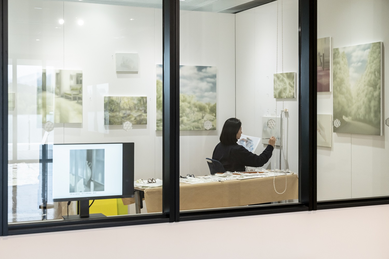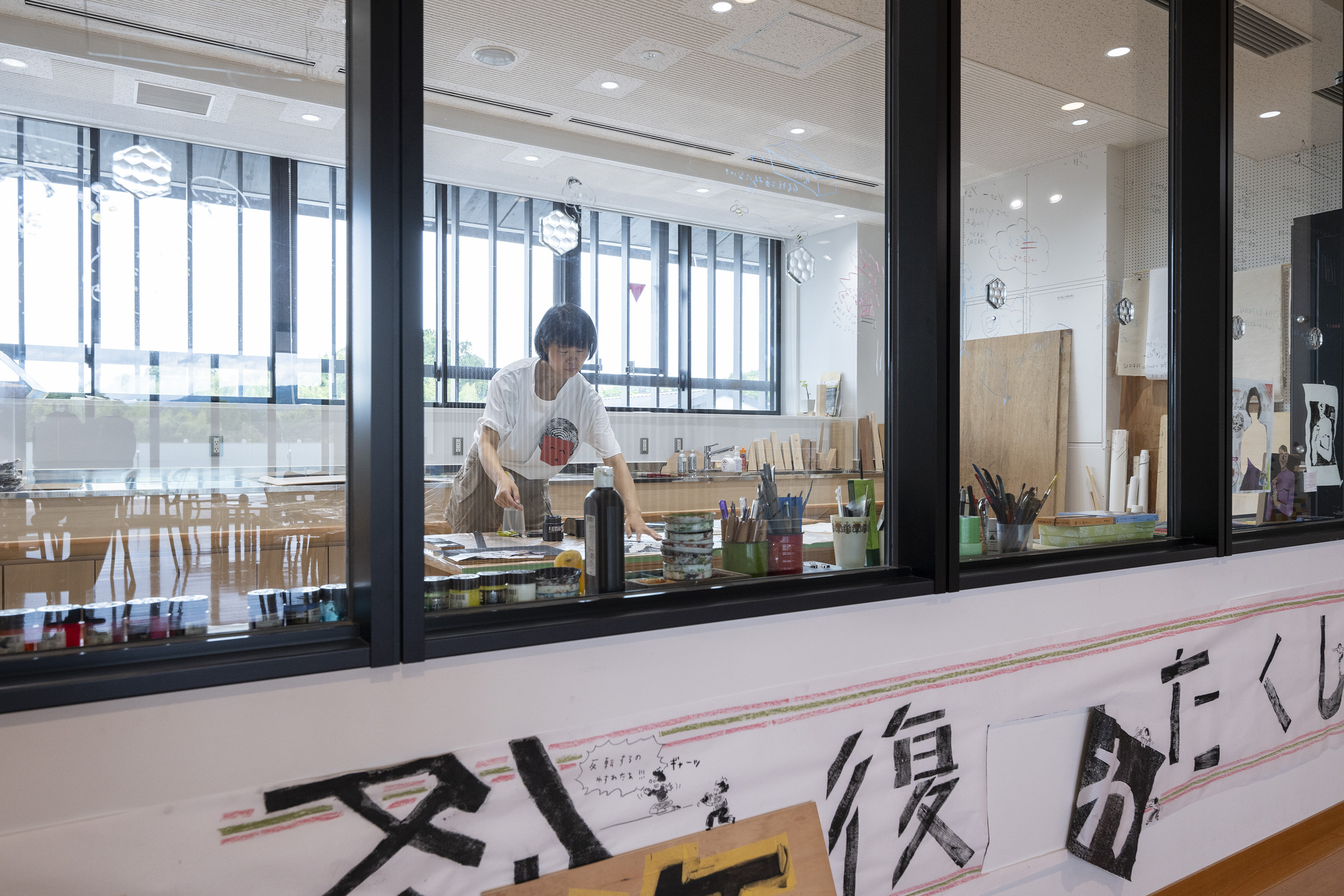 制作空間と展示空間が同居する細長いスタジオで、公開制作と作品展示を並行して行いました。