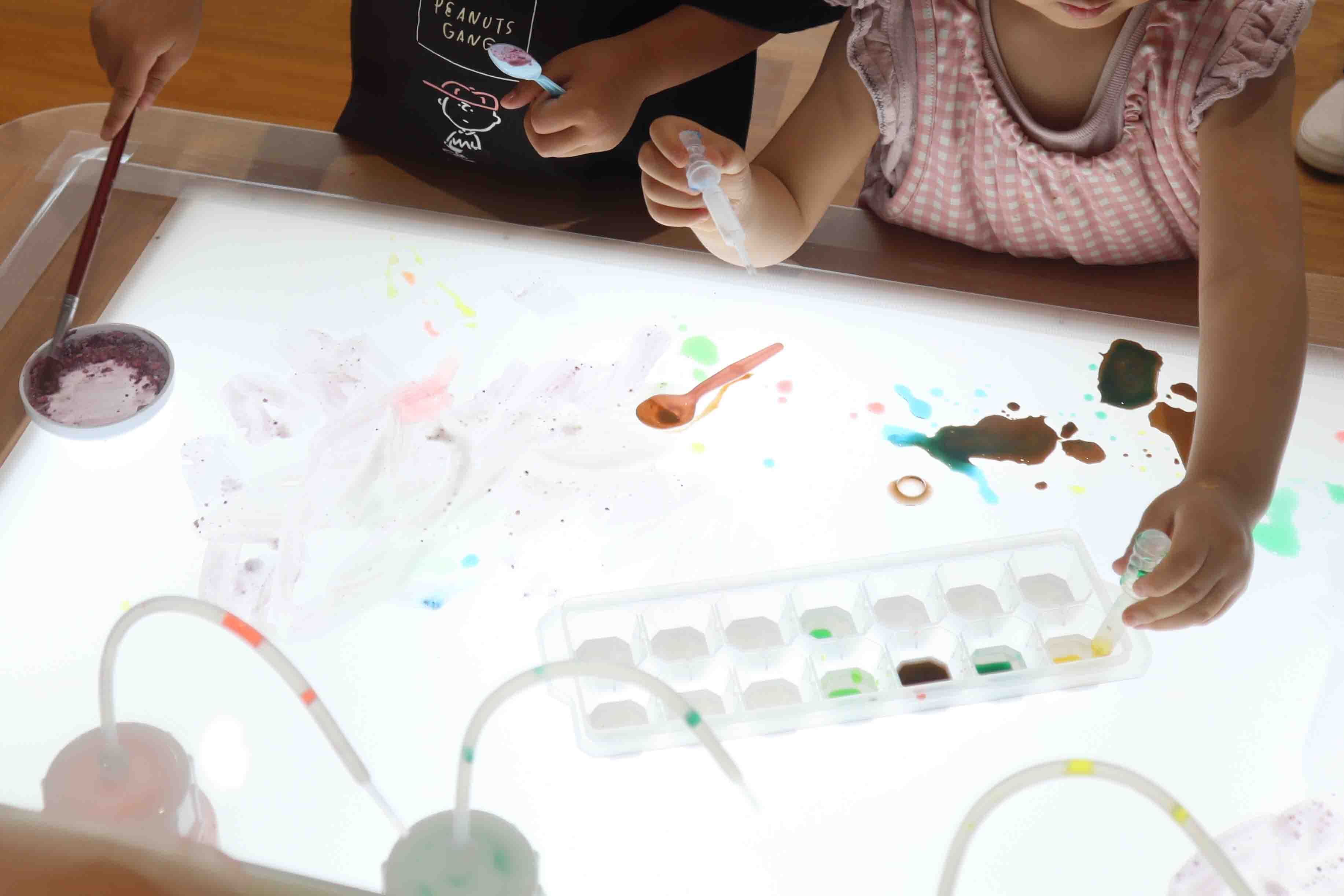 いろんな素材や道具をつかって「いろ」作りを楽しみます。そざいをこなにしたり、まぜたり、つくった「いろ」をさらに混ぜてみたり、色の不思議やヒミツをさぐります。みんなで色の研究者になりきろう!