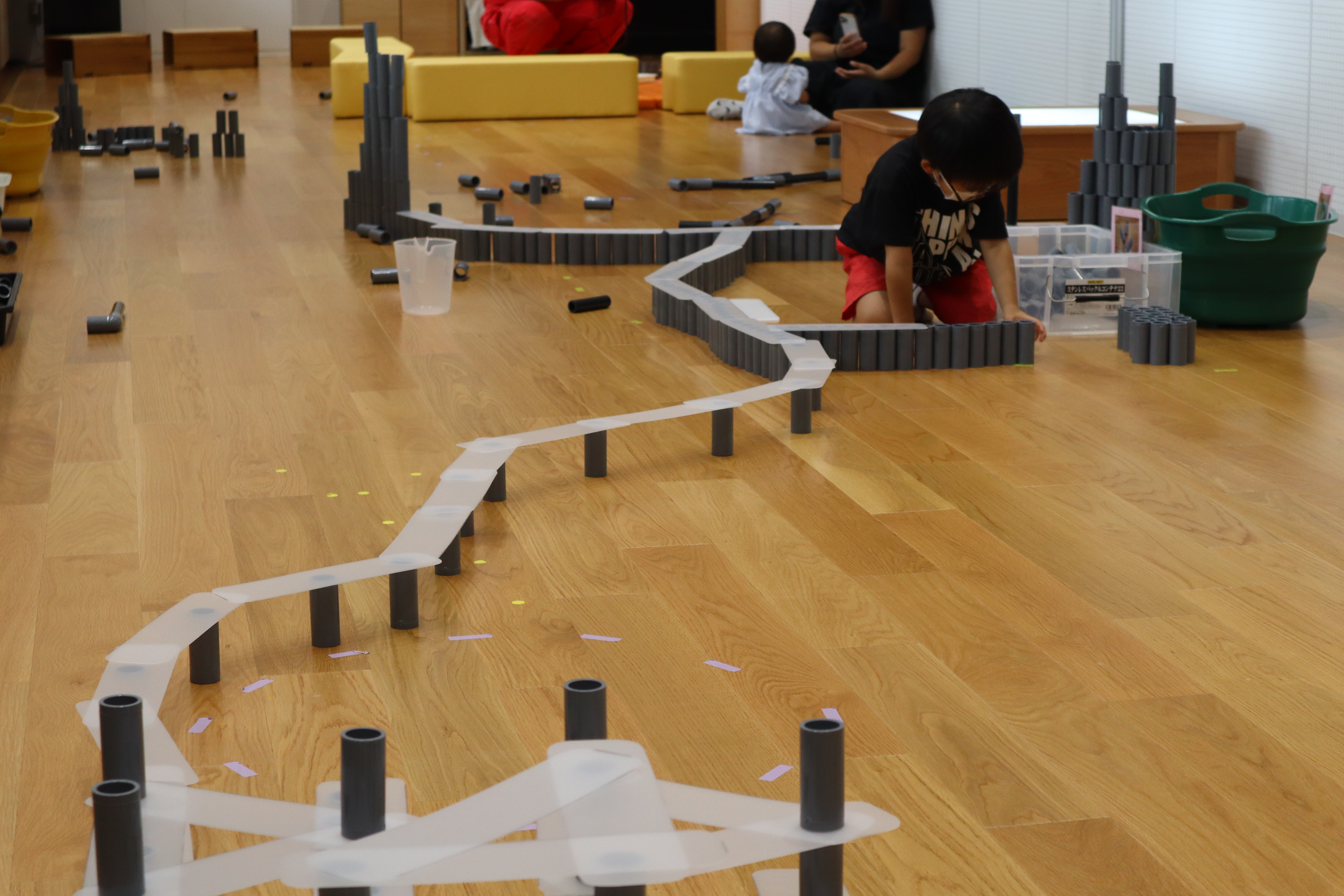 沢山のパイプを「つんだり」「ならべたり」遊んでみよう。いつの間にかどんどん広く大きく変化していくよ!となりの人の作品ともつなげてみよう!