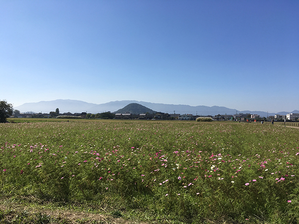 藤原京跡では、季節ごとの美しい花が植えられ色とりどりの花の絨毯が広がります。高い建物がないため、朝焼け、夕焼けも美しく素晴らしい展望が楽しめます。