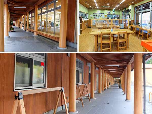 上右軽食コーナー・上左木製ベンチ・下サイクルラック