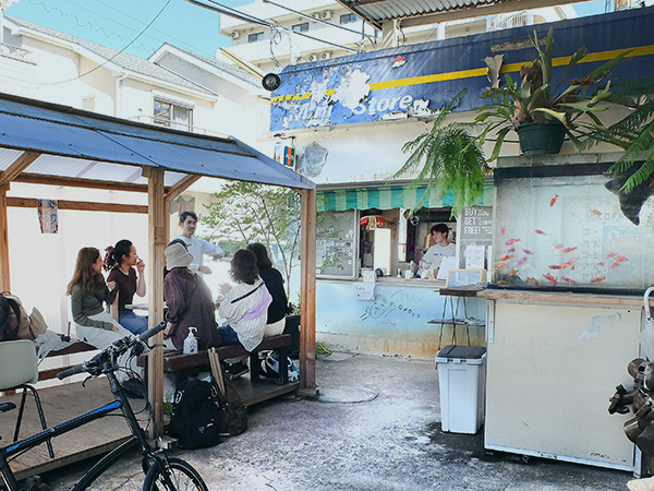金魚を眺めるオープンテラスではオーナーとのおしゃべりも楽しい