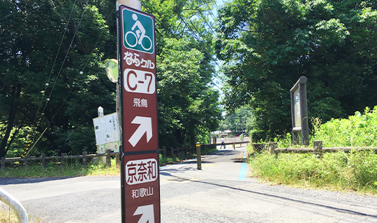 京都嵐山から和歌山港に至る延長約180km、奈良県内は延長約75kmのサイクリングルート。京奈和自転車道とならクルを使うことで、県内のみならず京都・奈良・和歌山間の広域周遊観光を楽しむことができます。