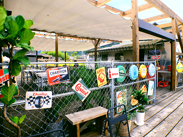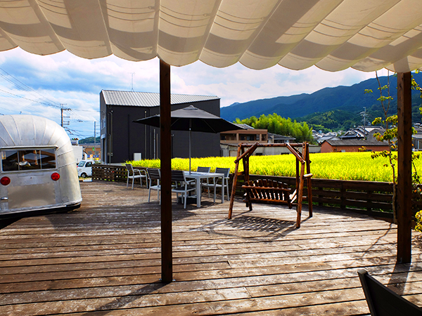 葛城・金剛山の雄大な姿を背景に、最古の国道竹内街道をおりた場所に2022年7月にオープンした高級キャンピングカーAIRSTREAMのあるカフェ。パノラマテラスでホットドッグをほおばりアメリカンな気分に!