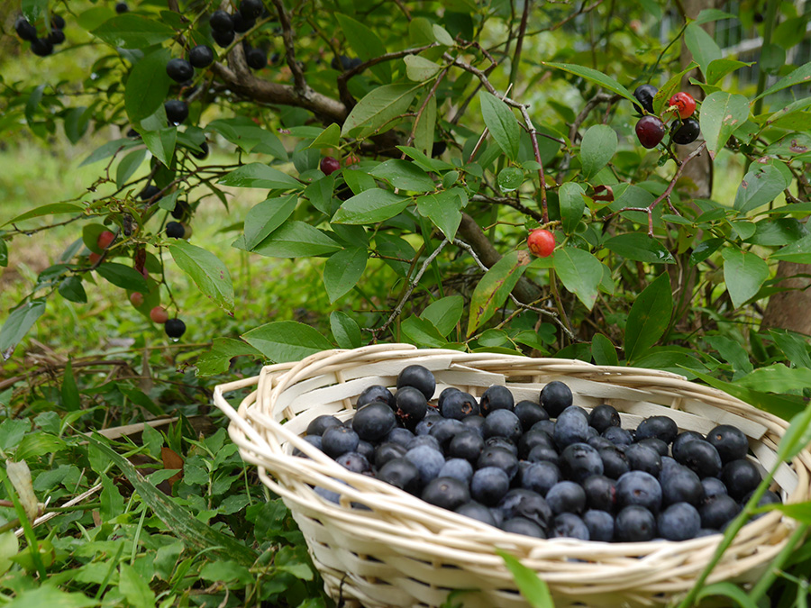 ブルーベリー収穫体験とブルーベリーに関する説明。