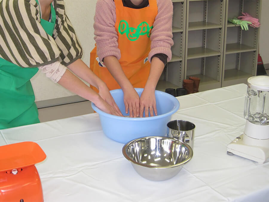 | 料金、条件 | こんにゃく教室料金:3,500円/1セット(1~5人) 出来上がったこんにゃく(約2kg)はお持ち帰りいただけます。 のどか村入園料:大人600円・小人350円 ※12~2月は、大人300円・小人100円 定員(口数):40人 時間:体験時間は約1時間です。その後ボイルしますので約90分後のお渡しとなります。 |