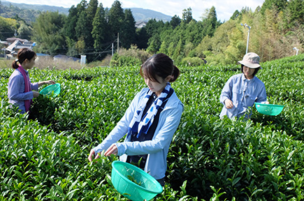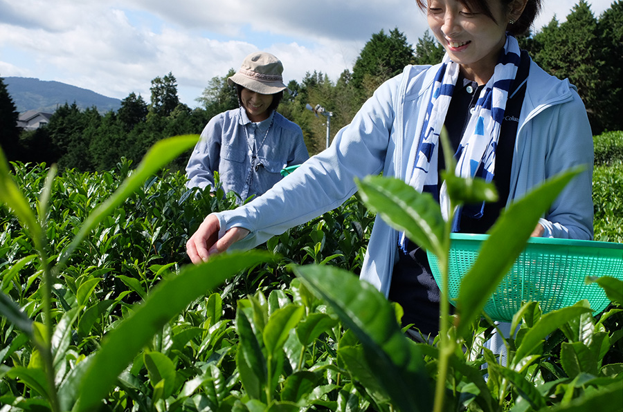 今回お2人をご案内するのは、ロマントピアで企画運営を担当する遠嶽(とおたけ)さん。歩いて15分ほどの場所にある緑まぶしい茶畑に到着すると、まずは茶摘みのコツをお勉強。上の方にある新芽を軽くつまんで引くと自然にプチっと摘みとれるポイントがあります。ここがおいしいお茶になる部分で、この新芽だけを集めたお茶が高級品となります。