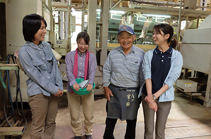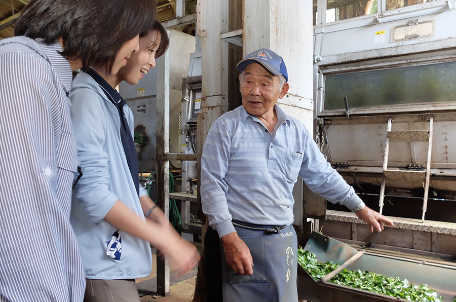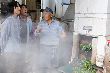 茶摘みが終わると、ロマントピアの館長を務める巽(たつみ)さんが運営する製茶工場で、摘んだ茶葉を製茶してもらいます。実は、摘みたての茶葉はまだお茶の香りがしません。蒸したり、揉んだりしているうちに徐々に、おいしそうなお茶の香りがしてきました。指導にあたった巽さんも、体験に参加されたお2人も終始笑顔で、とても楽しい茶摘み体験になったようです。