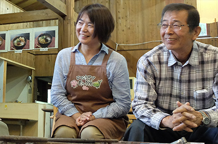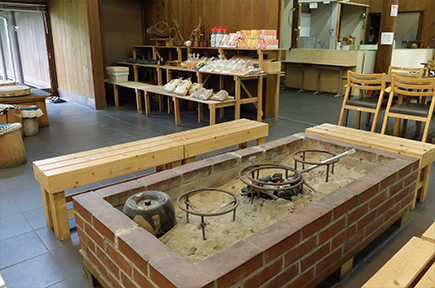 「夢っこ」は、地元月ヶ瀬の農家のお母さん8名が活動する組織です。設立当初からのお付き合いで、体験教室やイベントなどがあれば、館内の食堂で食事を提供しています。また、こんにゃく作り教室では講師を務めることもあります。食堂では、うどん中心のメニューで、地元で採れた山菜や椎茸などをふんだんに使っています。オリジナルの「田楽うどん」も人気で、田楽のこんにゃくはもちろん、私たちの手作りで、田楽味噌も自家製なんですよ。