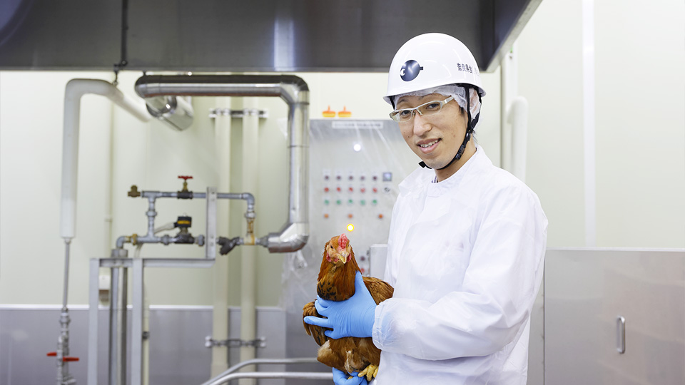 食鳥検査員として県産地鶏である「大和肉鶏」の食材としての安全性について検査し、加えて食鳥肉の生産工程におけるHACCP対応状況を日々監督しています。搬入された鶏の健康状態の確認に始まり、その肉や内臓を一体的に検査できることに面白みを感じます。