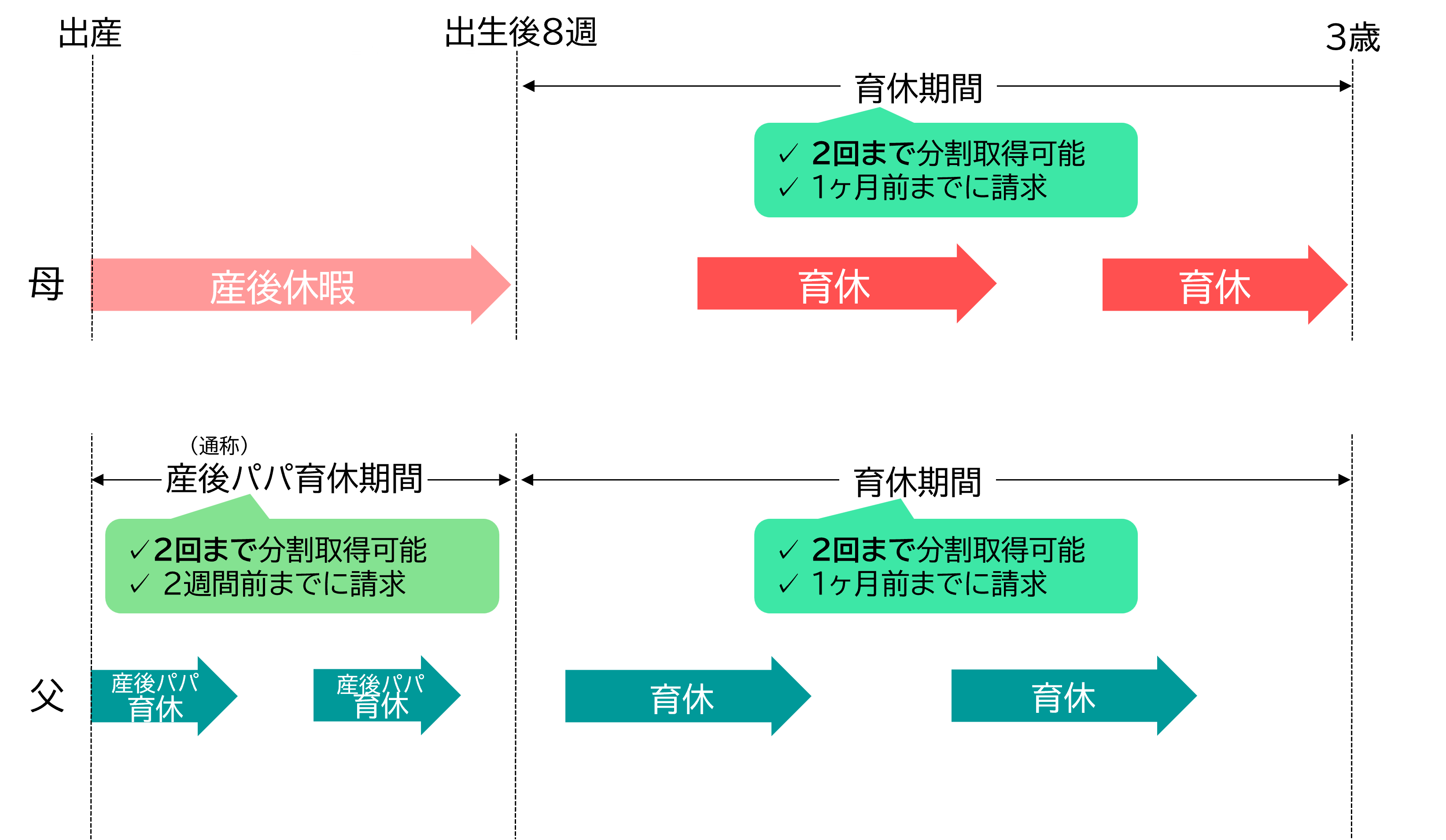 女性は産後休暇終了日の翌日から、男性は子どもの出生後から満3歳の誕生日の前日までに、原則2回取得することが可能です。