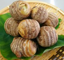 昭和初期から田原本町味間で作り続けられているサトイモ。外観は球状で、収穫する芋の数が多く、大きな芋(芋重50g以上)を多くつける豊産種。切った断面が白くてキメが細かく、粘りが強いのが特徴。