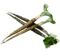 四十日群から系統選抜された、直径3cmぐらいの細い大根。根は曲がりやすく、手や鍬等で丁寧に土寄せをして育てられます。大和のお正月には、円満を意味した輪切りの祝だいこん、人参、里いもと角を削ぎ落とした豆腐を白みそ仕立てにした雑煮が多く食されます。