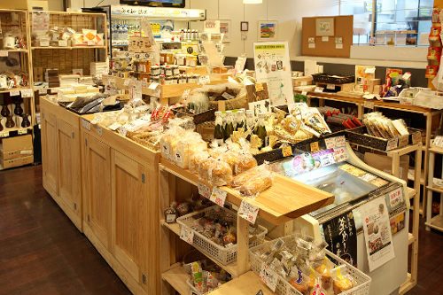 店頭に並ぶ青々とした新鮮野菜に誘われて中に入ると、農・畜産加工品や奈良のお土産品がぎっしり! 奥にはごはんを食べられるあイートインもあります。