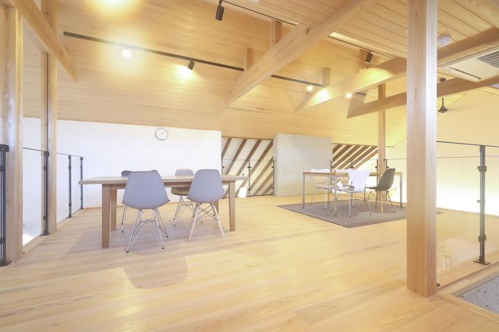 ロフトのような吹き抜けの空間になっている2階には、吉野スギを中心とした天然の大谷石(おおやいし)や珪藻土などの自然素材が使われています。冷蔵庫に入った吉野スギと他の国産スギを取り出して触るという体験ができるのも、展示場ならでは。もちろん吉野スギが冷たくないことは、あえて詳しくご報告するまでもありません。