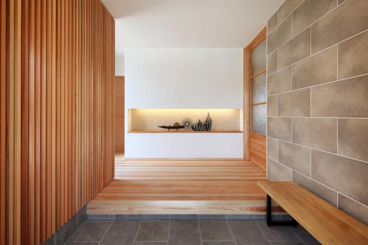 ABC奈良・登美ヶ丘住宅公園内にある「登美ヶ丘展示場」は、広いエントランスから吉野スギの格子で目隠しをしたシューズクロークなどの収納スペースがあり、「吉野杉の床」の使い方で縦と横のラインの面白さを感じさせます。