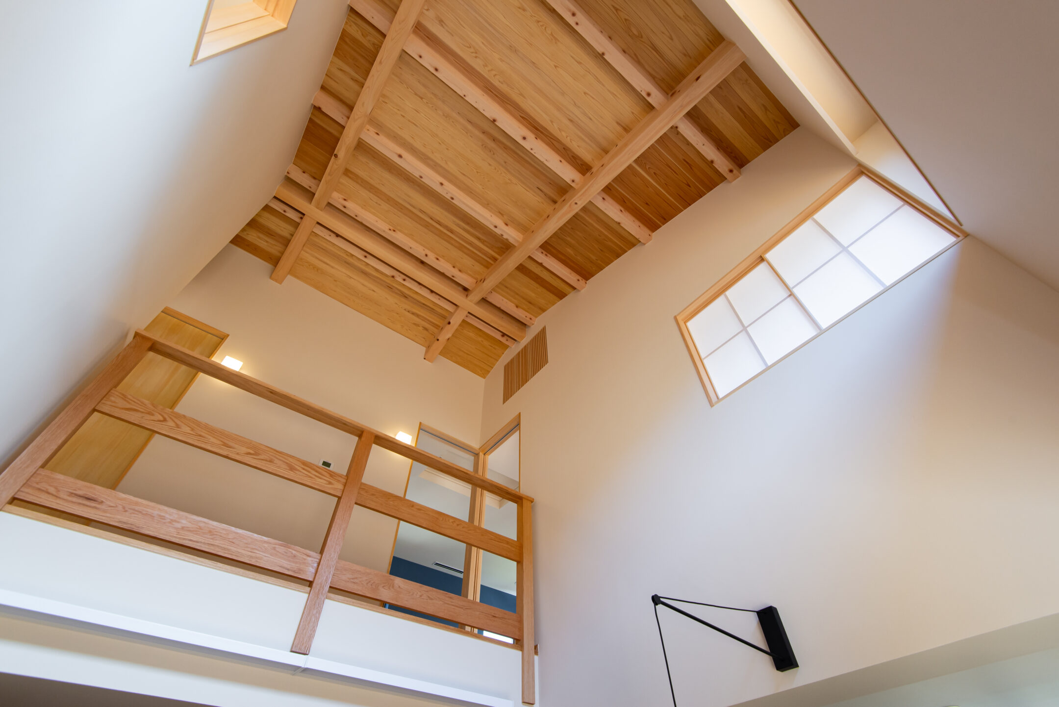 屋根の勾配を使った登り梁で美しく、開放的な空間に