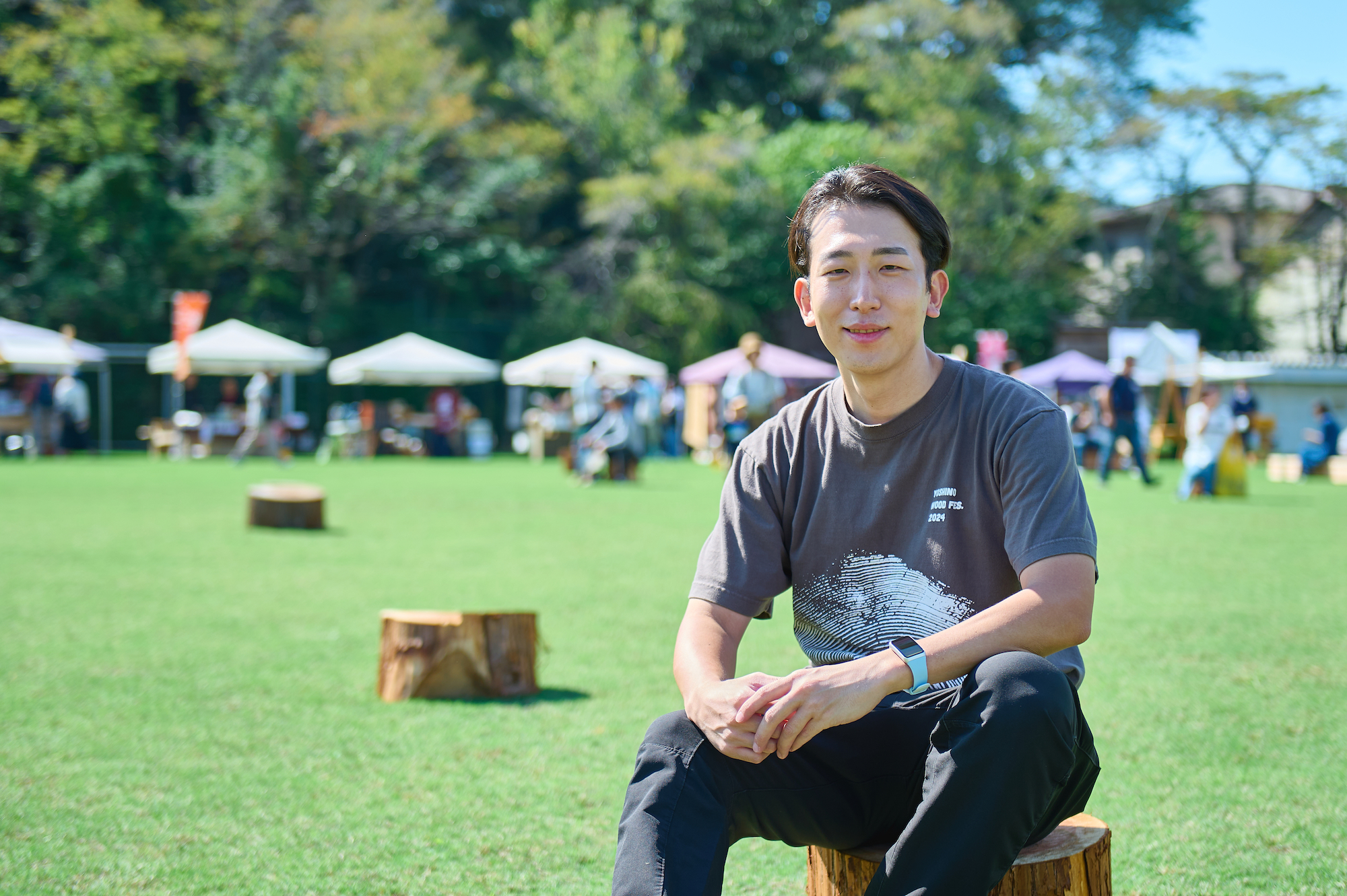 「よしのウッドフェス」を企画・運営する一般社団法人「吉野と暮らす会」の吉川晃日(よしかわこうひ)さんにお話を伺いました。吉川さんは元々大阪出身で、大学生の時に「吉野と暮らす会」が運営する「吉野杉の家」のプロジェクトに参加したことをきっかけに吉野町での活動をスタート。現在は林業や自然からかけ離れ場所で過ごしていた「木の素人」という立場を活かして、一般の人々にもわかりやすく、木の魅力や吉野のまちの魅力を発信されています。吉川さんが「よしのウッドフェス」の企画・運営に関わりはじめたのは2023年開催の第2回から。吉川さん以外にも「吉野と暮らす会」には、吉野山の旅館で働く方、川上村の地域おこし協力隊、大阪で活動するデザイナーなど、会の活動や想いに共感した、さまざまなフィールドで活躍する若者もメンバーとして参加しています。