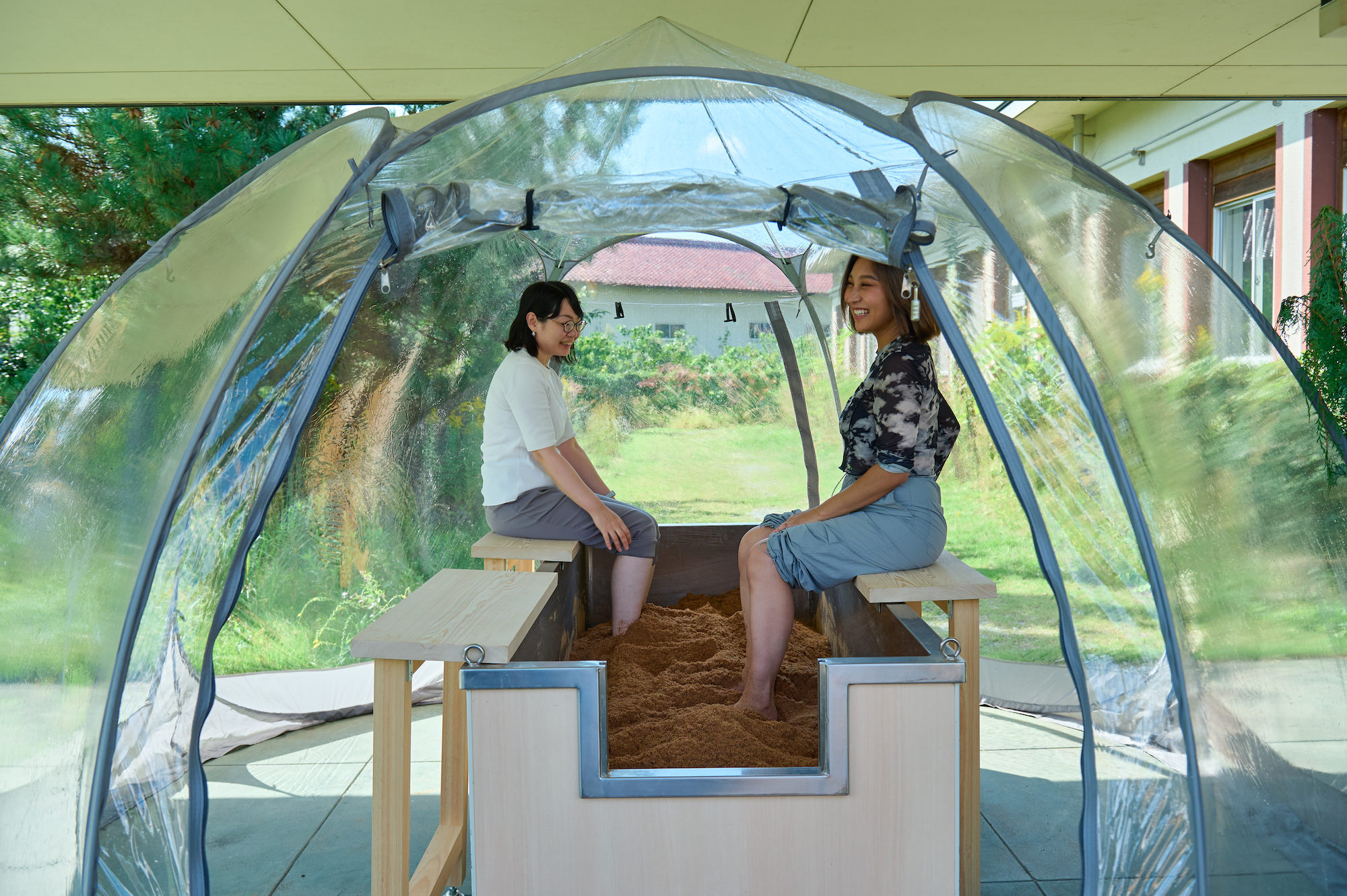 桧パウダーと桧の葉に米ぬかを混ぜたものを発酵させたときに発生する自然の発酵熱を利用した温浴(足浴)が体験できる「発酵温浴nifu」もおすすめです。桧のよい香りとともに身体の深部からしっかりと温めてくれます。インパクトのある木の使い方に触れて、木の魅力を体験していただけると思います。