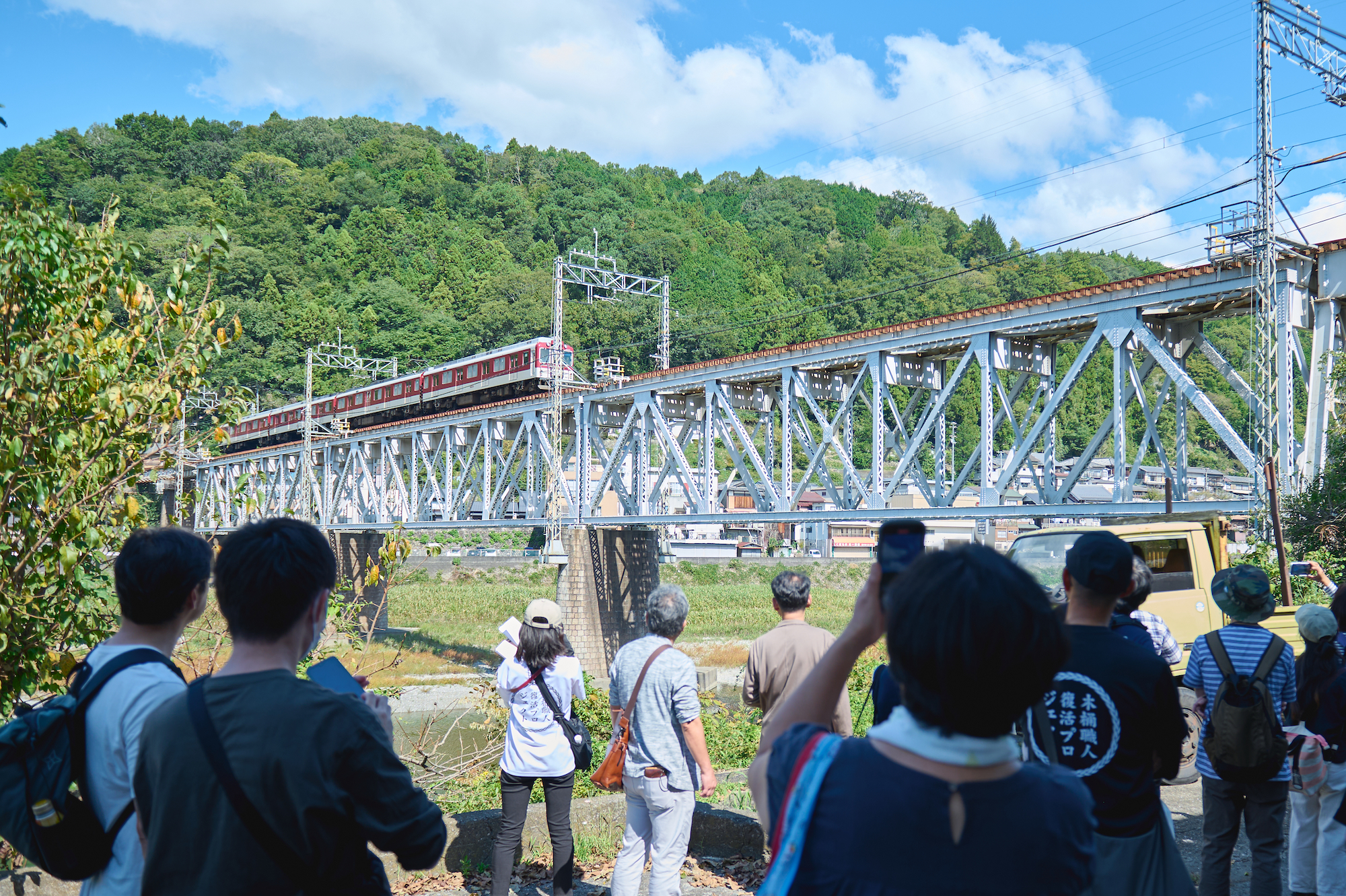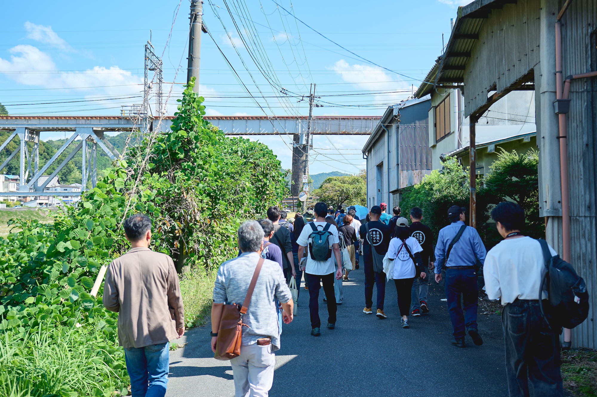 貯木場とは、材木を一時的に保管し、売買する場所のことをいいます。現在の吉野貯木場と呼ばれる地域には、40軒近くの木材関係施設が集まっており、まち全体がひとつの大きな製材所のような様相を呈しています。その様子を見学できるとあって多くの人が参加していました。