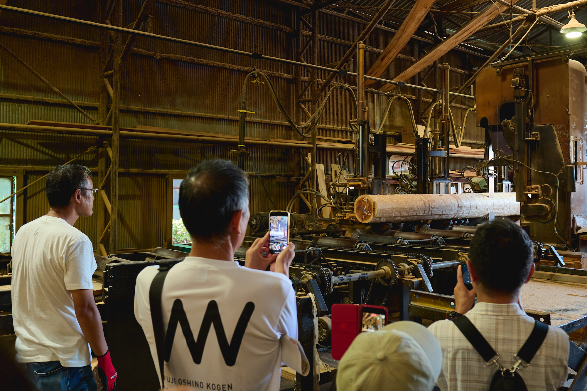 貯木まちあるきの折り返し地点である「吉野中央木材株式会社」では、今回特別に樹齢80年の吉野杉を帯ノコで切り出していく迫力満点のシーンを見せてもらいました。木の個性を生かし、一本一本を大切に使い切る丁寧な仕事がここにはあります。