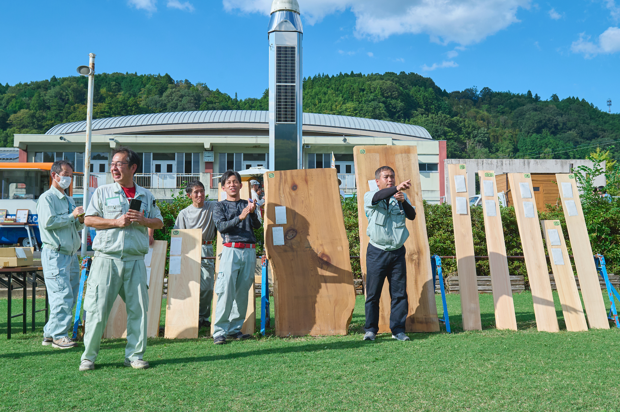 そして最後に取材チームが見学したのは「木の競り体験」。競りを進行するのは、普段は吉野町にある原木市場で働いている本物の「振り子(市を仕切り進める役割の人)」さん。少し早口の、独特のリズムで発される言い回しでテンポよく競りが進んでいきます。ハイライトは樹齢200年の吉野桧の一枚板。次々と手が挙がり、会場は大いに盛り上がりました。