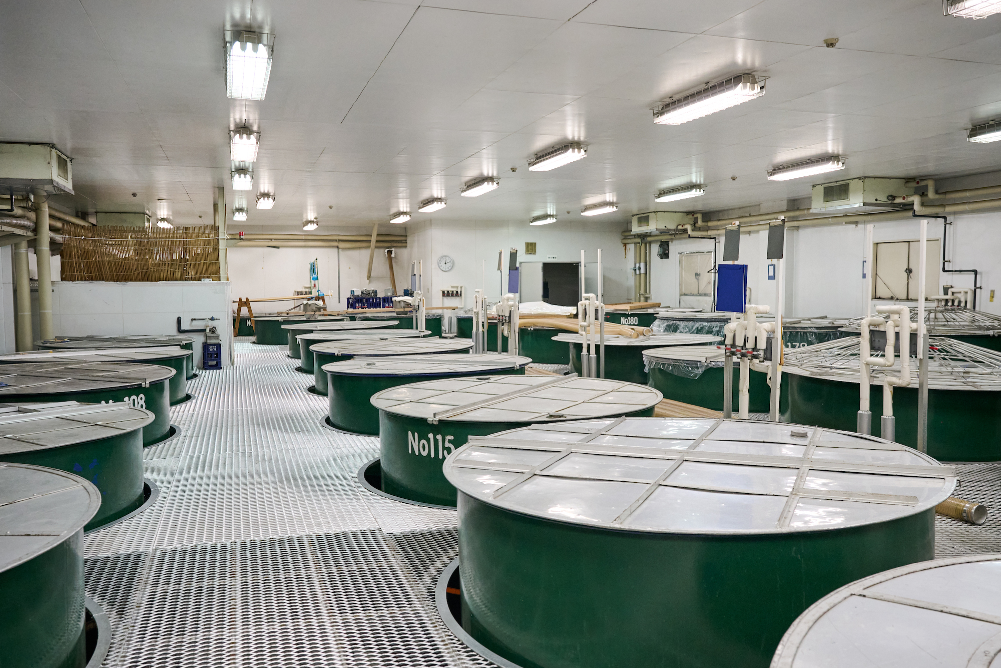 次は酒母室へ。まず、小さめのタンクに米麹と蒸米、水、酵母、乳酸を加え、発酵させて酒母にします。酒母とは別名を酛(もと)といい、その名の通りお酒の“もと”となるもの。できあがった酒母は醗酵室の大タンクに移し、米麹と蒸米、水を3回に分けて加えていき(三段仕込み)、もろみを造ります。醗酵室には巨大なタンクがいくつも並び、多い時には全部のタンクがお酒でいっぱいになることもあるそうですよ。